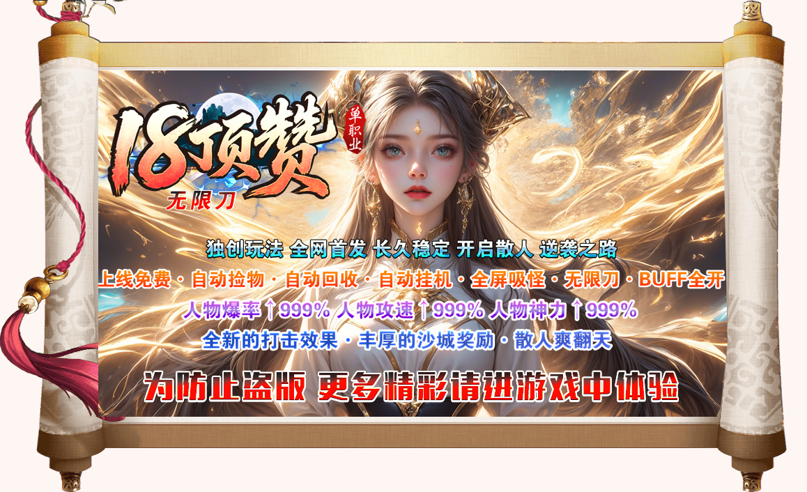 ◆18顶赞◆120格大背包◆免费自动挂机◆免费自动回收◆免费自动捡取◆自动吸怪◆自动穿戴◆无限刀◆